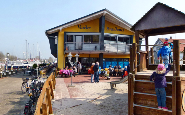 Hier erleben Sie süffige und leckere selbstgebraute Biere, das Tide-Bier! Es wird ein naturtrübes Helles, dunkles Bier, Weizen und Pils ausgeschenkt. Genießen Sie Essen und Trinken in maritimer Atmosphäre, direkt am Vareler Hafen. Ebenso erleben Sie in einer maritimen Atmosphäre und mit Blick auf den Vareler Hafen eine kulinarische Reise durch die Meereswelt. Gerade im Sommer können Sie und Ihre Kinder auf der Hafenterasse und dem hauseigenen Spielplatz mit Spielboot (Daje) Meeresluft direkt schnuppern.