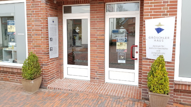 Wir befinden uns auf 140 Quadratmetern im Erdgeschoss eines Klinkerhauses in der Großen Wasserpfortstraße 19, 26441 Jever. Das Haus schloss 1954 die hier seit der Zerstörung der jeverschen Synagoge durch den Novemberpogrom 1938 klaffende Baulücke. Im Neubau haben sich Reste der Mikwe und der jüdischen Schule erhalten. Wir haben uns nach den beiden letzten Vorstehern der Jüdischen Gemeinde Jever, den Brüdern Hermann (1880 Jever–1944 KZ Bergen-Belsen) und Julius Gröschler (1884 Jever–1944 Auschwitz) benannt.Der Arbeitskreis Gröschler Haus im Jeverländischen Altertums- und Heimatverein e.V. betreut die Einrichtung ehrenamtlich und entwickelt sie zusammen mit dem Schlossmuseum Jever weiter. Wir sind aus einem 1979 am Mariengymnasium Jever begründeten regionalen Projekt zur Erforschung der NS-Geschichte hervorgegangen. Träger des Gröschler Hauses ist der Zweckverband Schlossmuseum Jever, den der Landkreis Friesland, die Stadt Jever und der Jeverländische Altertums- und Heimatverein e.V. Jever bilden, Geschäftsführerin: Dr. Antje Sander. Das Gröschler Haus ist Bestandteil der Initiative “Erinnerungsorte in Friesland” des Zweckverbandes. Die Internetzeitschrift groeschlerhaus.eu wird von Hartmut Peters herausgegeben.