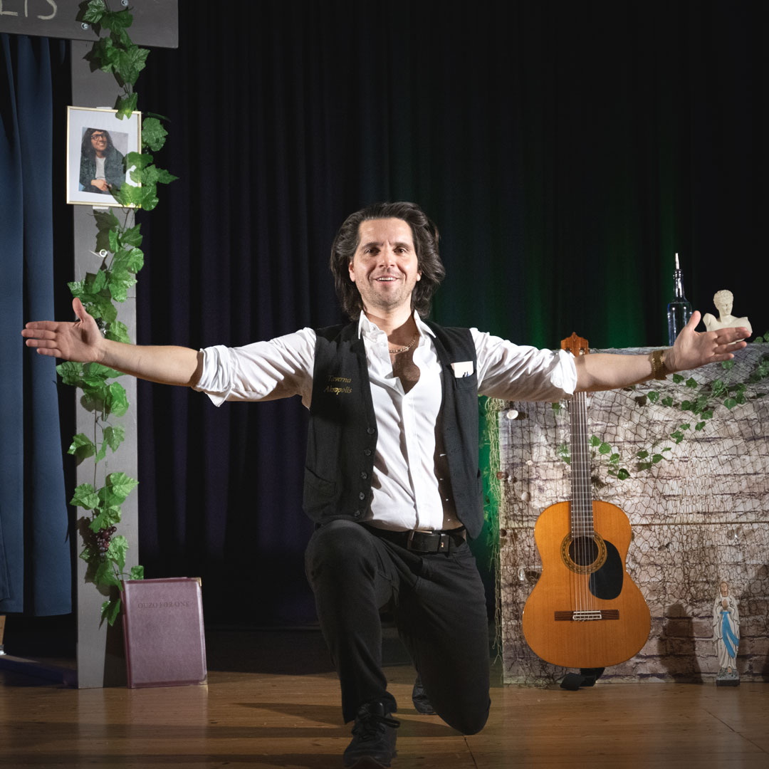 Kalispera, herzlich willkommen in der Taverna Akropolis! Dort bewirtet Sie Costa, der dabei mit Leichtigkeit durch die Genres tanzt: Von der Stand-up-Comedy hinein in den Liederabend und im Syrtaki zurück zur klassischen Komödie. Und obwohl nur ein einziger Schauspieler auf der Bühne steht, werden Sie die Tavernen-Atmosphäre spüren und die vielen Gäste und ihre Eigenheiten kennen und lieben lernen – ganz anders als Costa, der nach jedem Gast erstmal einen Ouzo braucht …