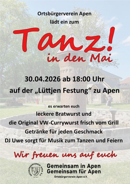 Der Ortsbürgerverein Apen (OBV) lädt auch in diesem Jahr wieder herzlich zum traditionellen „Tanz in den Mai“ ein. Am Mittwoch, den 30. April 2026, verwandelt sich die Lüttje Festung am Viehmarktplatz in Apen ab 18 Uhr in einen lebendigen Treffpunkt für Jung und Alt.